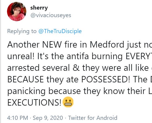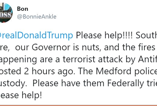 No reporting, local or national media, has blamed antifa for these wildfires. In fact, police in Medford, Oregon have specifically had to refute fake posts going around on Facebook about the arrests of “antifa arsonists.”